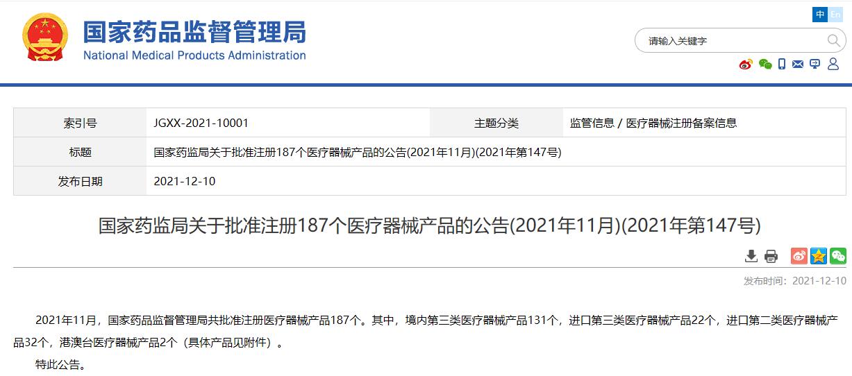 國家藥監(jiān)局關(guān)于批準(zhǔn)注冊187個醫(yī)療器械產(chǎn)品的公告(2021年11月)(2021年第147號)