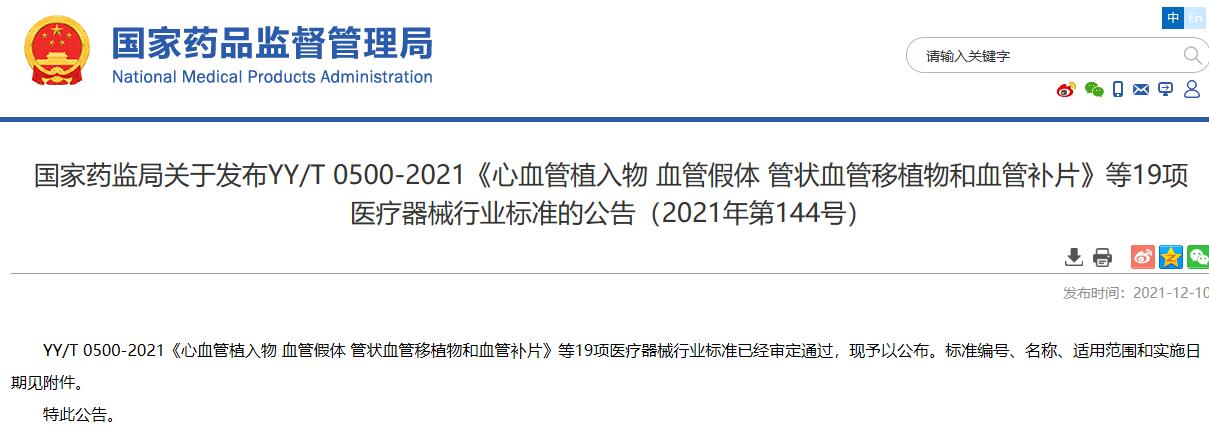 國家藥監(jiān)局關(guān)于發(fā)布YY/T 0500-2021《心血管植入物 血管假體 管狀血管移植物和血管補(bǔ)片》等19項(xiàng) 醫(yī)療器械行業(yè)標(biāo)準(zhǔn)的公告(2021年第144號)