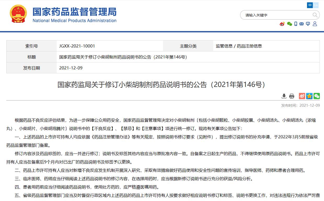 國家藥監(jiān)局關(guān)于修訂小柴胡制劑藥品說明書的公告(2021年第146號)