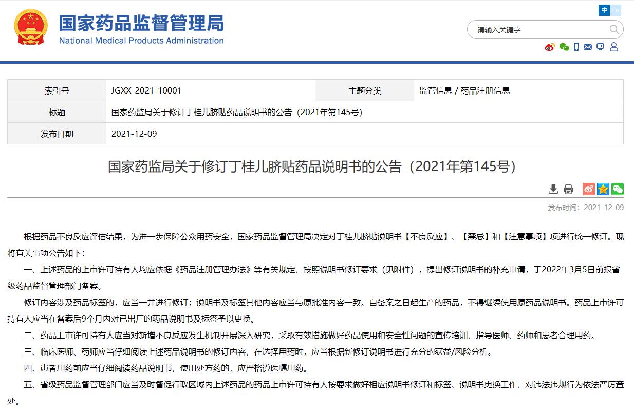 國家藥監(jiān)局關(guān)于修訂丁桂兒臍貼藥品說明書的公告(2021年第145號)