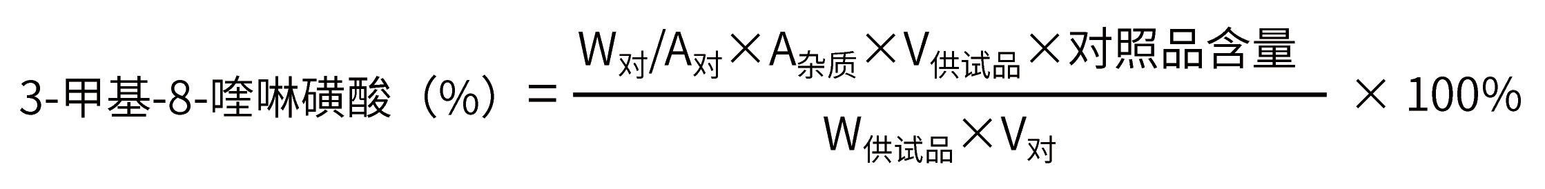 注:W對:對照品溶液稱樣量,mg; W供試品:供試品稱樣量,mg; A對:對照品溶液色譜圖中3-甲基-8-喹啉磺酸峰面積; A雜質(zhì):供試品溶液色譜圖中3-甲基-8-喹啉磺酸峰面積; V對:對照品溶液的稀釋倍數(shù); V供試品:供試品溶液的稀釋倍數(shù)。