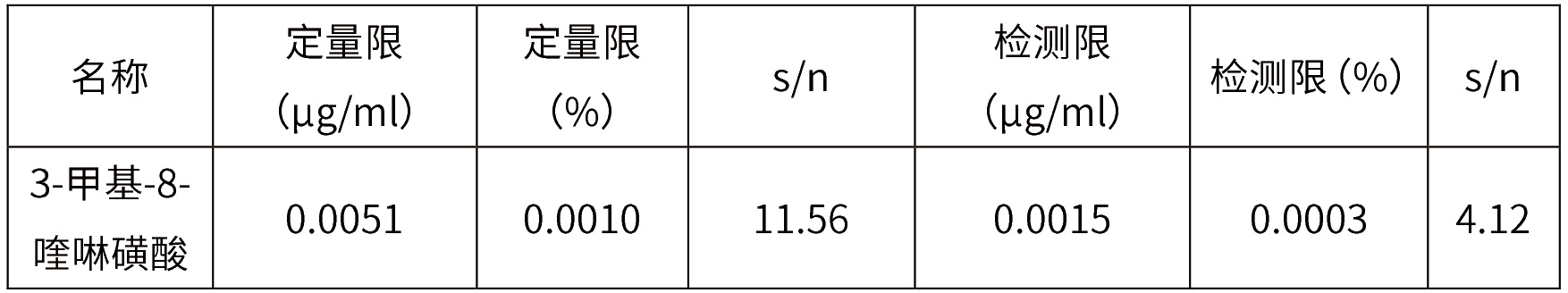 結(jié)論:3-甲基-8-喹啉磺酸定量限小于報告限度(0.05%)的50%,檢測限小于定量限的0.5倍,方法靈敏度符合要求。