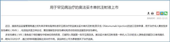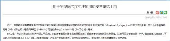 2021年,CDE發(fā)布兩則關(guān)于罕見病用藥的臨床研發(fā)指導(dǎo)原則,通過優(yōu)先審評審批方式批準2款罕見病用藥,分別為奧法妥木單抗注射液(用于治療成人復(fù)發(fā)型多發(fā)性硬化(RMS)) 和注射用司妥昔單抗(用于人體免疫缺陷病毒(HIV)陰性和人皰疹病毒8型(HHV-8)陰性的多中心Castleman?。∕CD)成人患者)。