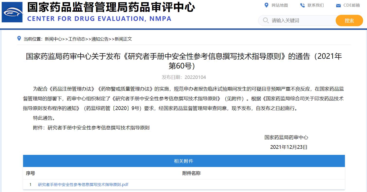 國(guó)家藥監(jiān)局藥審中心關(guān)于發(fā)布《研究者手冊(cè)中安全性參考信息撰寫技術(shù)指導(dǎo)原則》的通告(2021年第60號(hào))