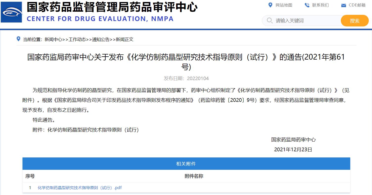 國(guó)家藥監(jiān)局藥審中心關(guān)于發(fā)布《化學(xué)仿制藥晶型研究技術(shù)指導(dǎo)原則(試行)》的通告(2021年第61號(hào))