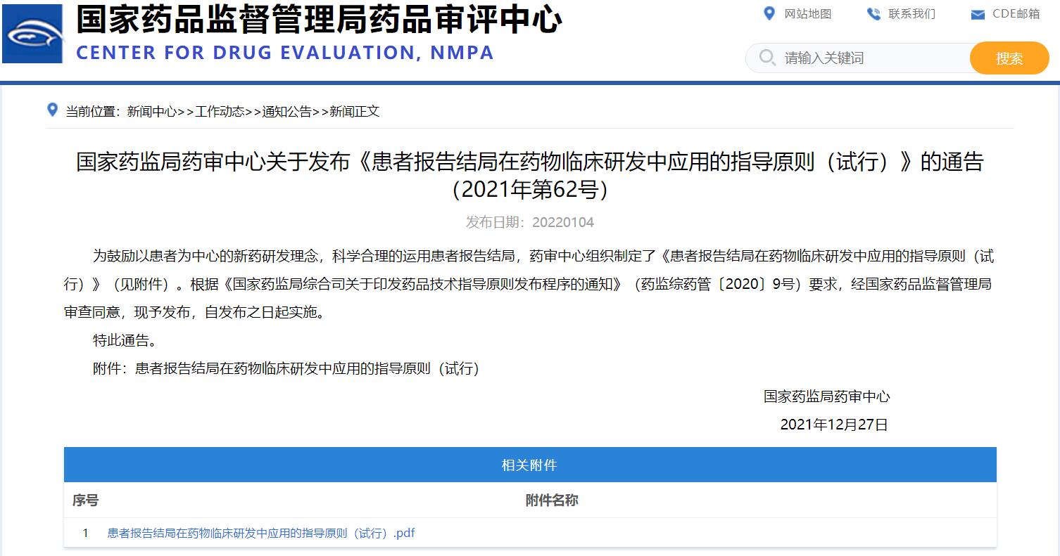 國(guó)家藥監(jiān)局藥審中心關(guān)于發(fā)布《患者報(bào)告結(jié)局在藥物臨床研發(fā)中應(yīng)用的指導(dǎo)原則(試行)》的通告(2021年第62號(hào))