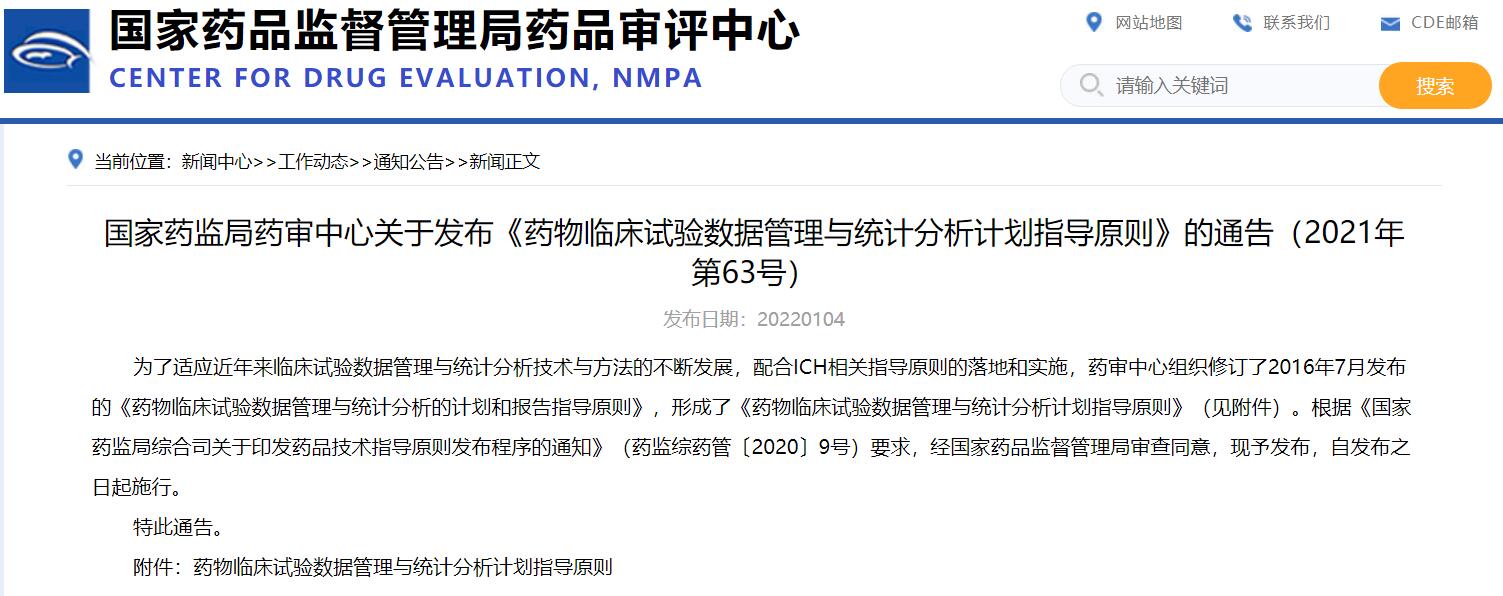 國(guó)家藥監(jiān)局藥審中心關(guān)于發(fā)布《藥物臨床試驗(yàn)數(shù)據(jù)管理與統(tǒng)計(jì)分析計(jì)劃指導(dǎo)原則》的通告(2021年第63號(hào))