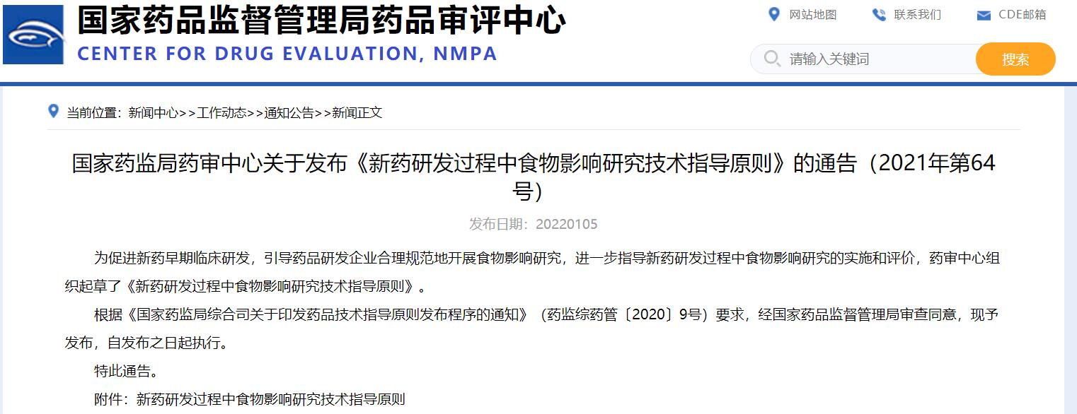 國(guó)家藥監(jiān)局藥審中心關(guān)于發(fā)布《新藥研發(fā)過程中食物影響研究技術(shù)指導(dǎo)原則》的通告(2021年第64號(hào))