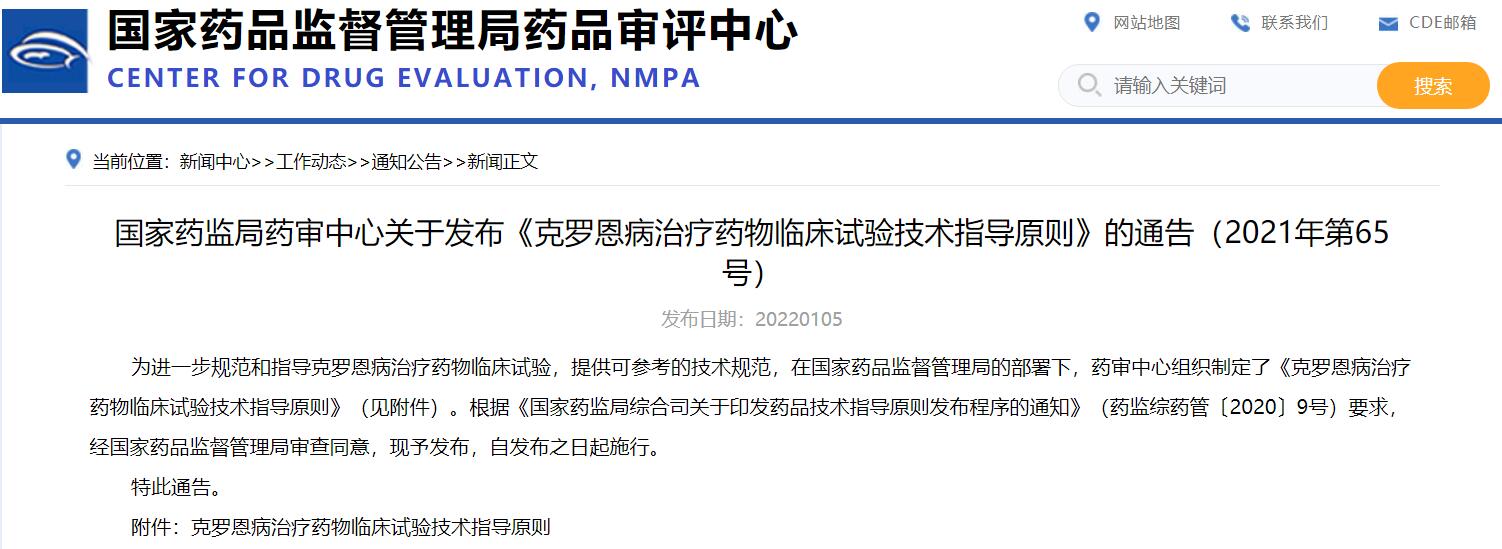 國(guó)家藥監(jiān)局藥審中心關(guān)于發(fā)布《克羅恩病治療藥物臨床試驗(yàn)技術(shù)指導(dǎo)原則》的通告(2021年第65號(hào))