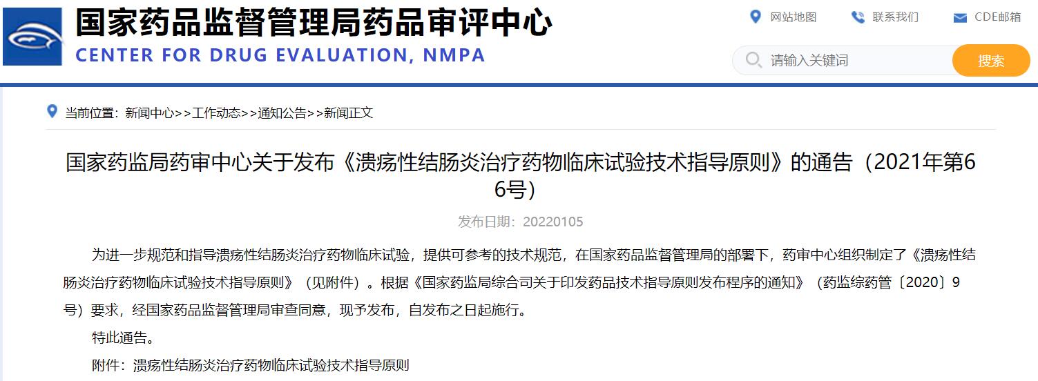 國(guó)家藥監(jiān)局藥審中心關(guān)于發(fā)布《潰瘍性結(jié)腸炎治療藥物臨床試驗(yàn)技術(shù)指導(dǎo)原則》的通告(2021年第66號(hào))