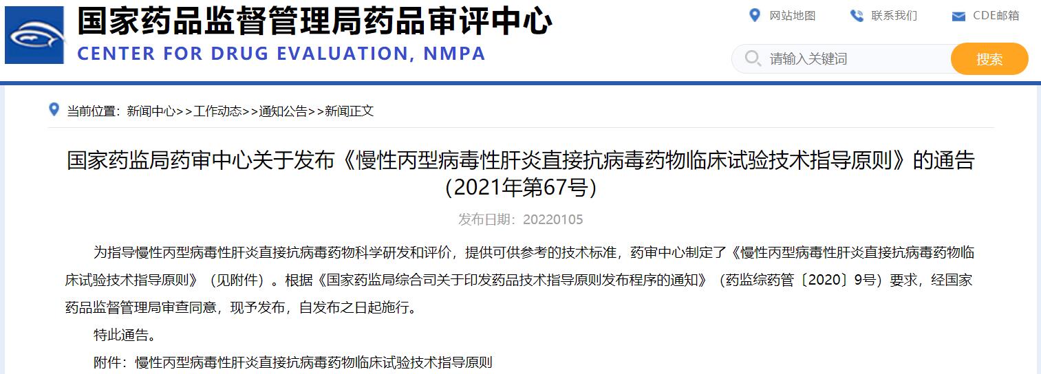 國(guó)家藥監(jiān)局藥審中心關(guān)于發(fā)布《慢性丙型病毒性肝炎直接抗病毒藥物臨床試驗(yàn)技術(shù)指導(dǎo)原則》的通告(2021年第67號(hào))
