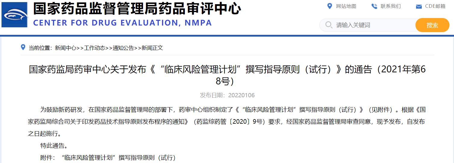 國(guó)家藥監(jiān)局藥審中心關(guān)于發(fā)布《“臨床風(fēng)險(xiǎn)管理計(jì)劃”撰寫指導(dǎo)原則(試行)》的通告(2021年第68號(hào))