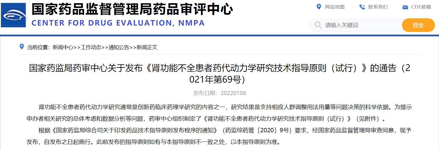 國(guó)家藥監(jiān)局藥審中心關(guān)于發(fā)布《腎功能不全患者藥代動(dòng)力學(xué)研究技術(shù)指導(dǎo)原則(試行)》的通告(2021年第69號(hào))