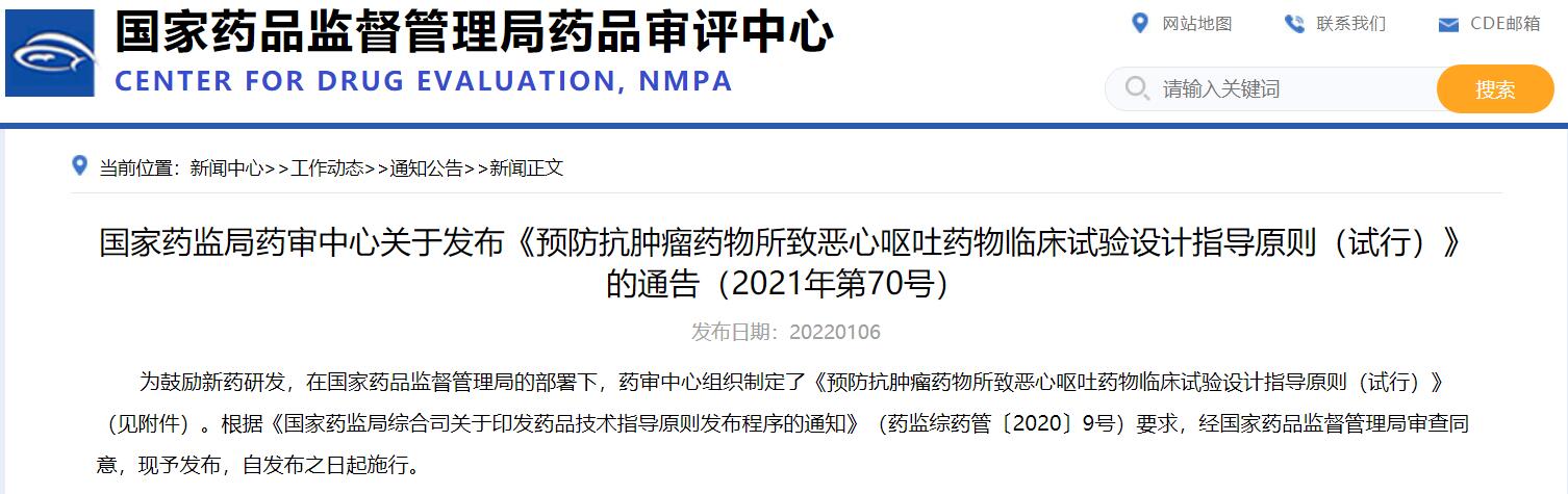 國(guó)家藥監(jiān)局藥審中心關(guān)于發(fā)布《預(yù)防抗腫瘤藥物所致惡心嘔吐藥物臨床試驗(yàn)設(shè)計(jì)指導(dǎo)原則(試行)》的通告(2021年第70號(hào))