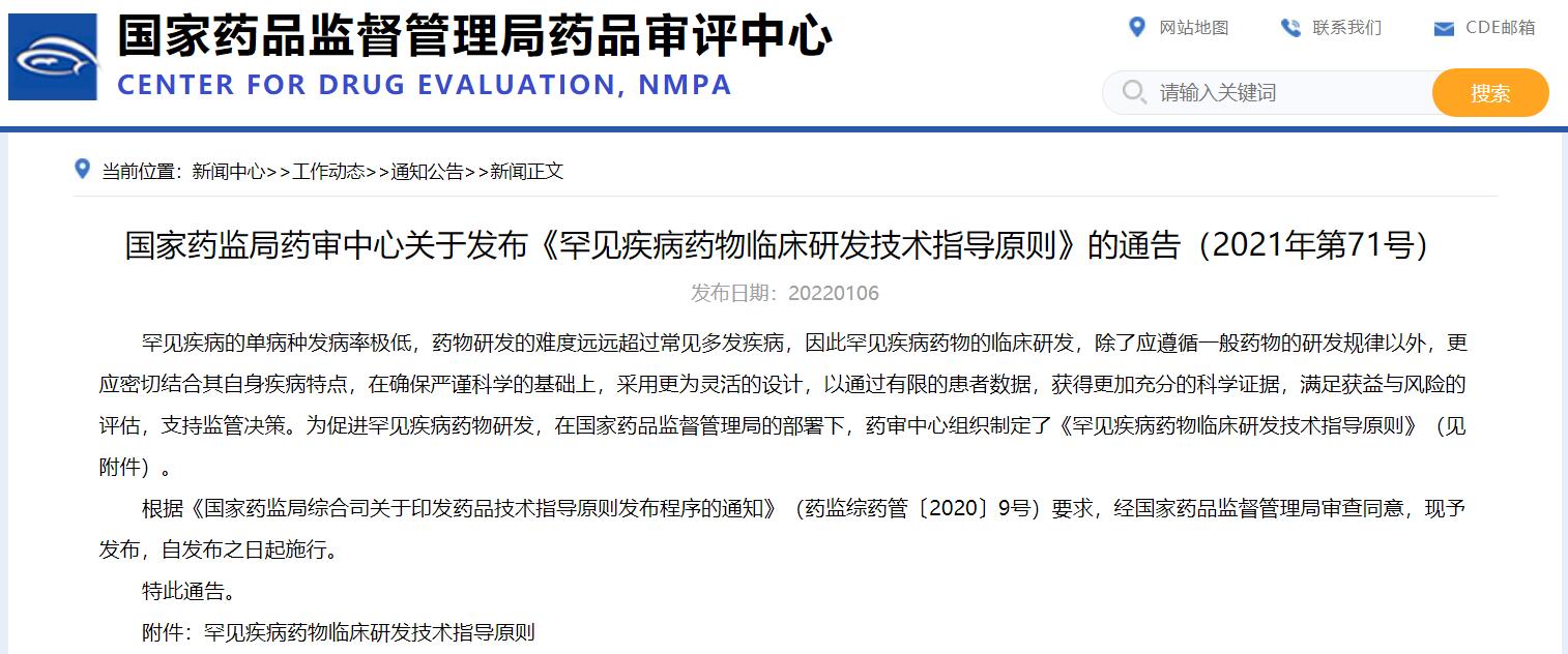 國(guó)家藥監(jiān)局藥審中心關(guān)于發(fā)布《罕見疾病藥物臨床研發(fā)技術(shù)指導(dǎo)原則》的通告(2021年第71號(hào))