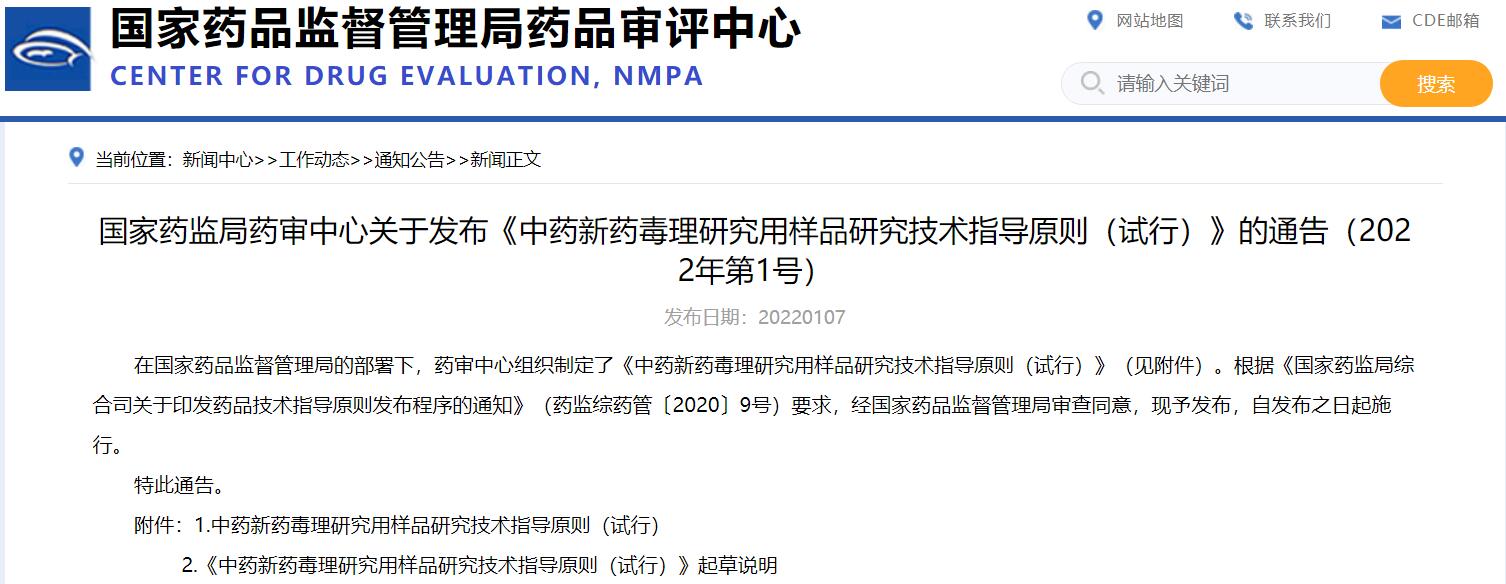 國(guó)家藥監(jiān)局藥審中心關(guān)于發(fā)布《中藥新藥毒理研究用樣品研究技術(shù)指導(dǎo)原則(試行)》的通告 (2022年第1號(hào))