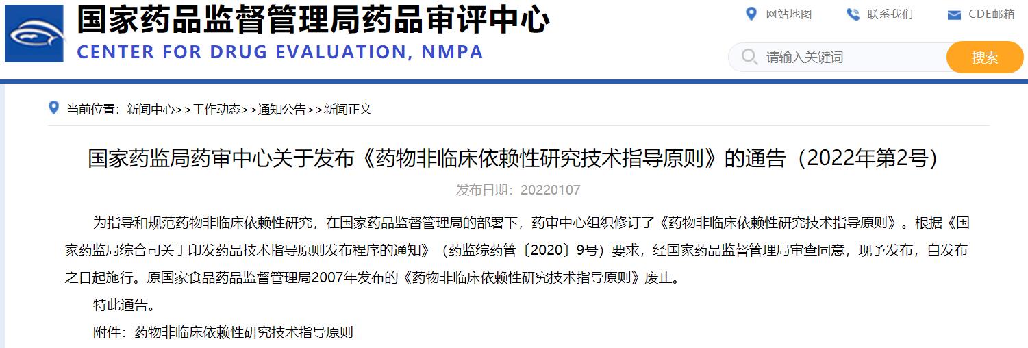 國(guó)家藥監(jiān)局藥審中心關(guān)于發(fā)布《藥物非臨床依賴性研究技術(shù)指導(dǎo)原則》的通告(2022年第2號(hào))