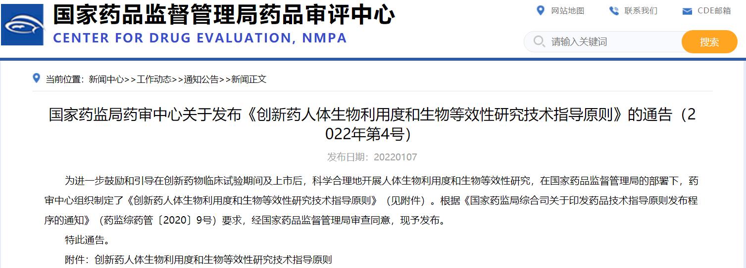 國(guó)家藥監(jiān)局藥審中心關(guān)于發(fā)布《創(chuàng)新藥人體生物利用度和生物等效性研究技術(shù)指導(dǎo)原則》的通告(2022年第4號(hào))