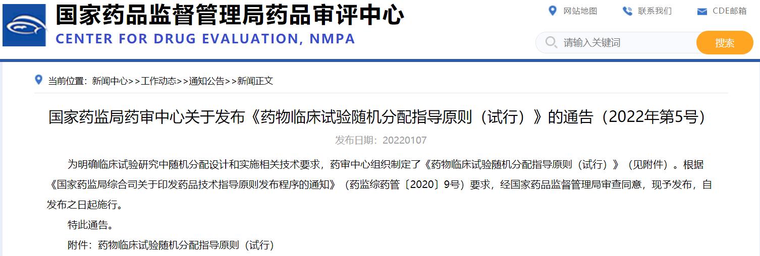 國(guó)家藥監(jiān)局藥審中心關(guān)于發(fā)布《藥物臨床試驗(yàn)隨機(jī)分配指導(dǎo)原則(試行)》的通告(2022年第5號(hào))