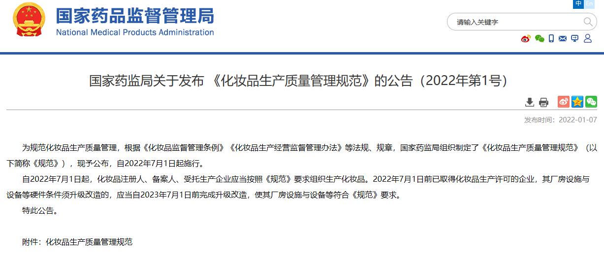 國(guó)家藥監(jiān)局關(guān)于發(fā)布 《化妝品生產(chǎn)質(zhì)量管理規(guī)范》的公告(2022年第1號(hào))