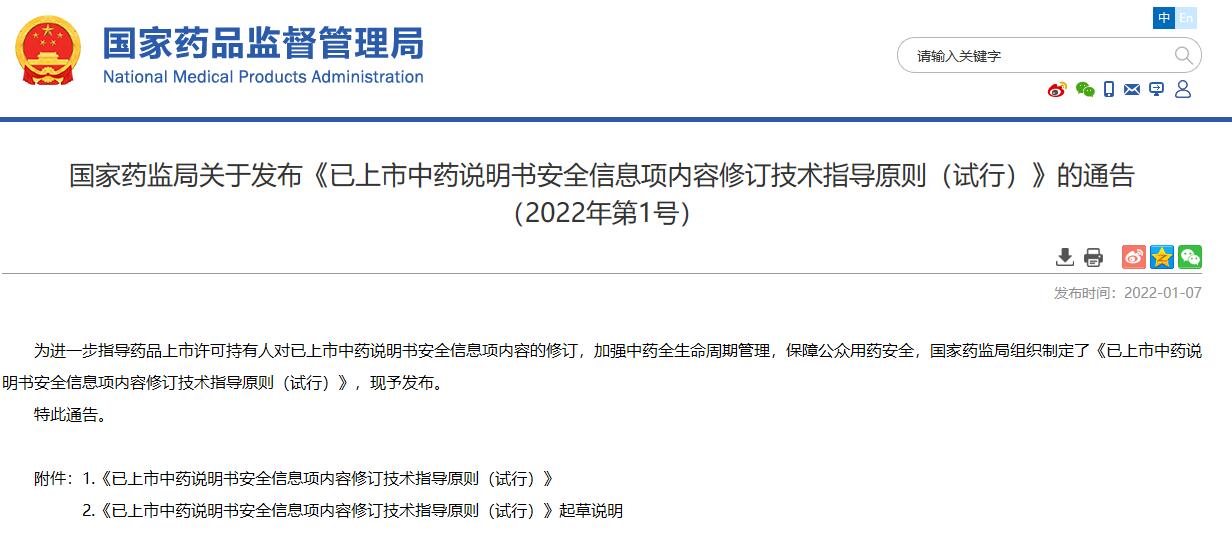 國(guó)家藥監(jiān)局關(guān)于發(fā)布《已上市中藥說明書安全信息項(xiàng)內(nèi)容修訂技術(shù)指導(dǎo)原則(試行)》的通告 (2022年第1號(hào))