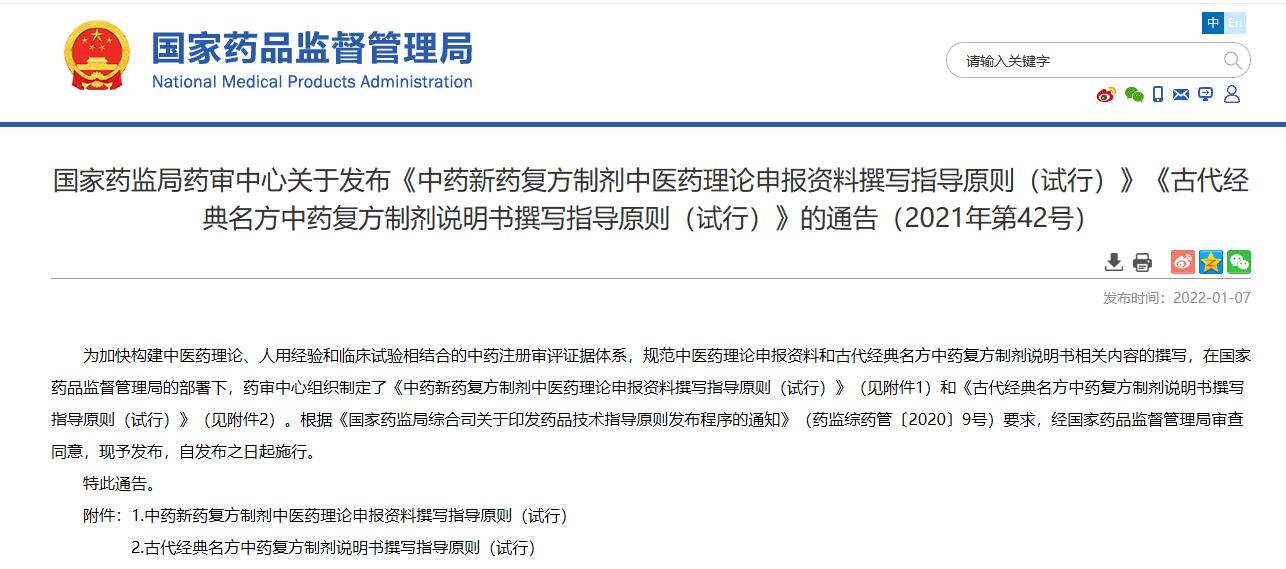 國(guó)家藥監(jiān)局藥審中心關(guān)于發(fā)布《中藥新藥復(fù)方制劑中醫(yī)藥理論申報(bào)資料撰寫指導(dǎo)原則(試行)》《古代經(jīng)典名方中藥復(fù)方制劑說明書撰寫指導(dǎo)原則(試行)》的通告(2021年第42號(hào))