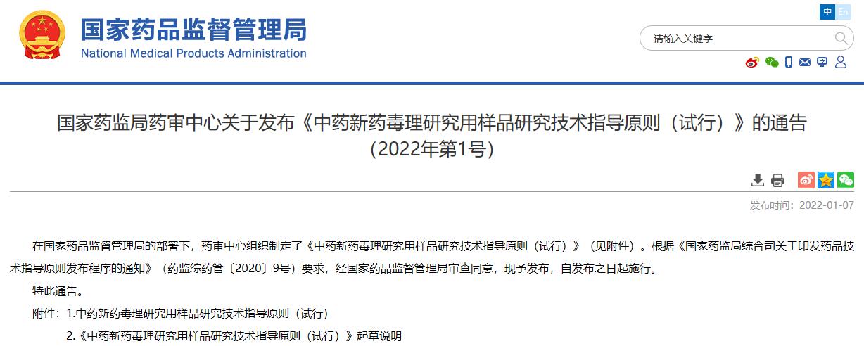國(guó)家藥監(jiān)局藥審中心關(guān)于發(fā)布《中藥新藥毒理研究用樣品研究技術(shù)指導(dǎo)原則(試行)》的通告(2022年第1號(hào))