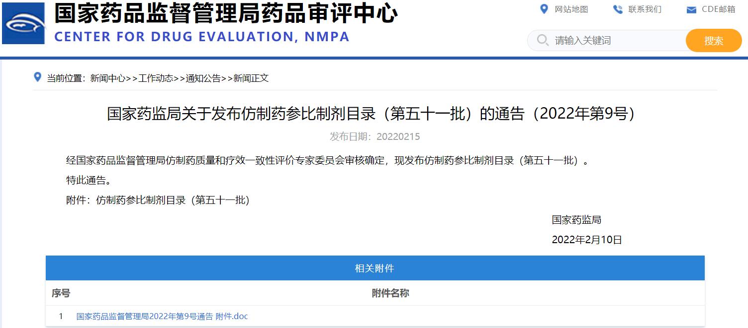 國(guó)家藥監(jiān)局關(guān)于發(fā)布仿制藥參比制劑目錄(第五十一批)的通告(2022年第9號(hào))