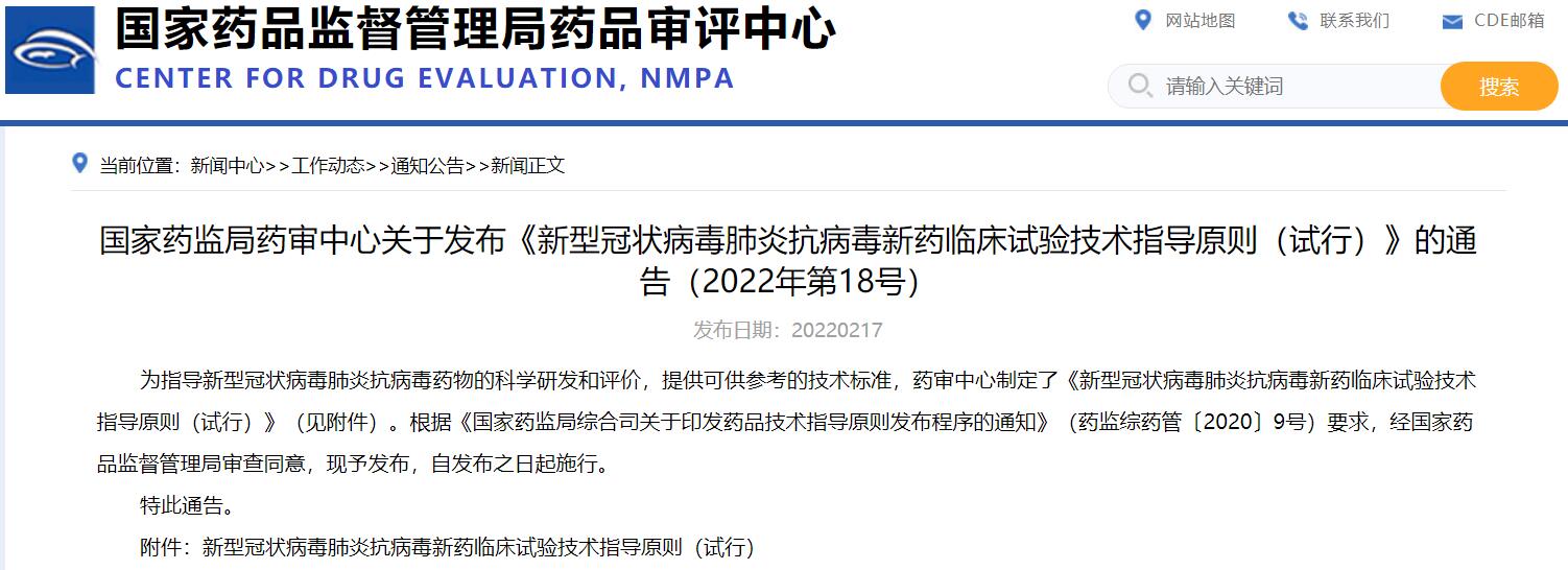 國(guó)家藥監(jiān)局藥審中心關(guān)于發(fā)布《新型冠狀病毒肺炎抗病毒新藥臨床試驗(yàn)技術(shù)指導(dǎo)原則(試行)》的通告(2022年第18號(hào))