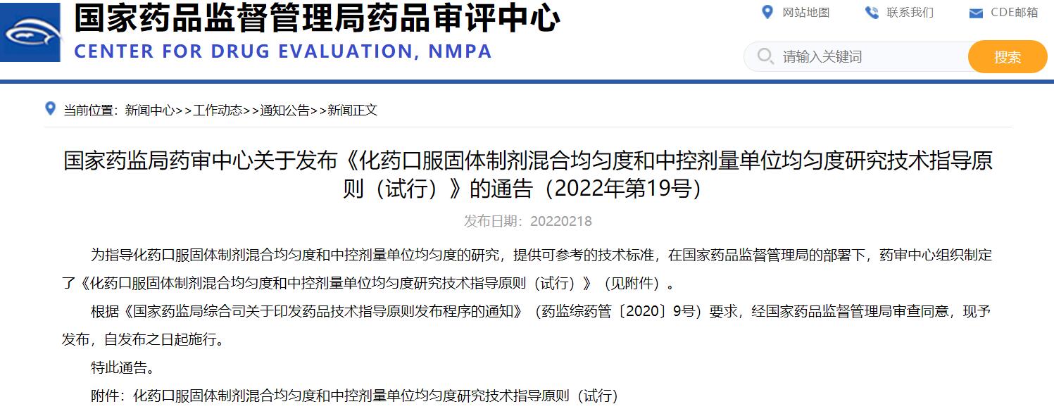 國(guó)家藥監(jiān)局藥審中心關(guān)于發(fā)布《化藥口服固體制劑混合均勻度和中控劑量單位均勻度研究技術(shù)指導(dǎo)原則(試行)》的通告(2022年第19號(hào))