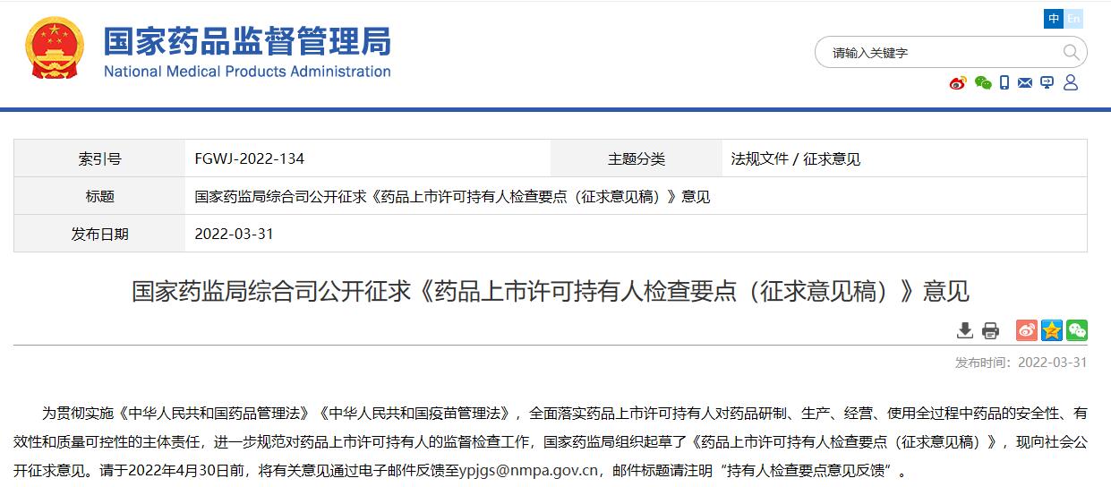 國家藥監(jiān)局綜合司公開征求《藥品上市許可持有人檢查要點(征求意見稿)》意見
