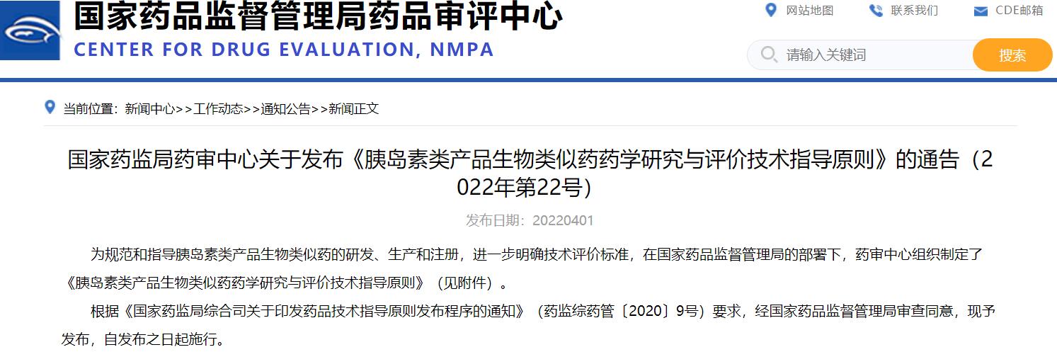 國家藥監(jiān)局藥審中心關(guān)于發(fā)布《胰島素類產(chǎn)品生物類似藥藥學(xué)研究與評價技術(shù)指導(dǎo)原則》的通告(2022年第22號)