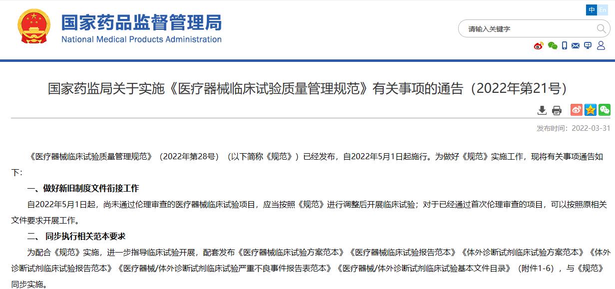國家藥監(jiān)局關(guān)于實施《醫(yī)療器械臨床試驗質(zhì)量管理規(guī)范》有關(guān)事項的通告(2022年第21號)