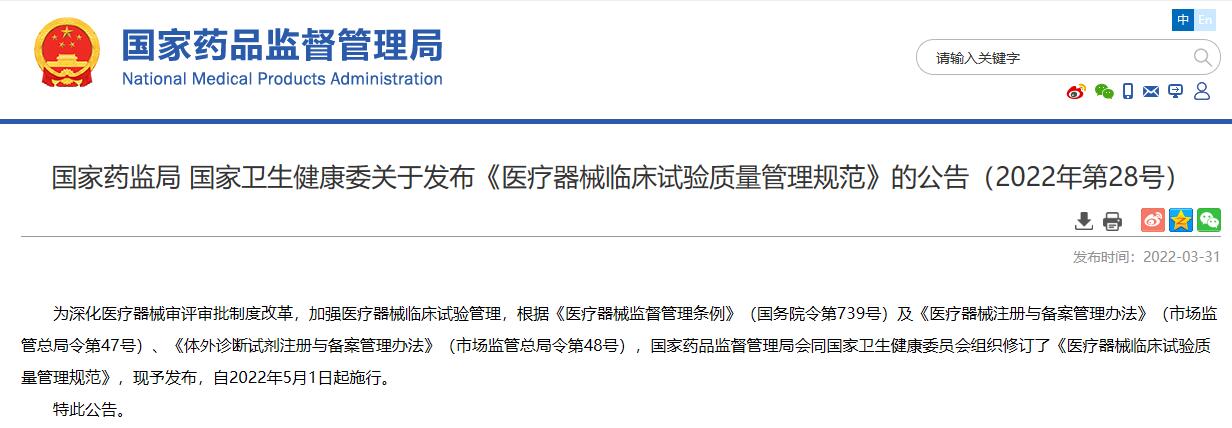 國家藥監(jiān)局 國家衛(wèi)生健康委關(guān)于發(fā)布《醫(yī)療器械臨床試驗質(zhì)量管理規(guī)范》的公告(2022年第28號)
