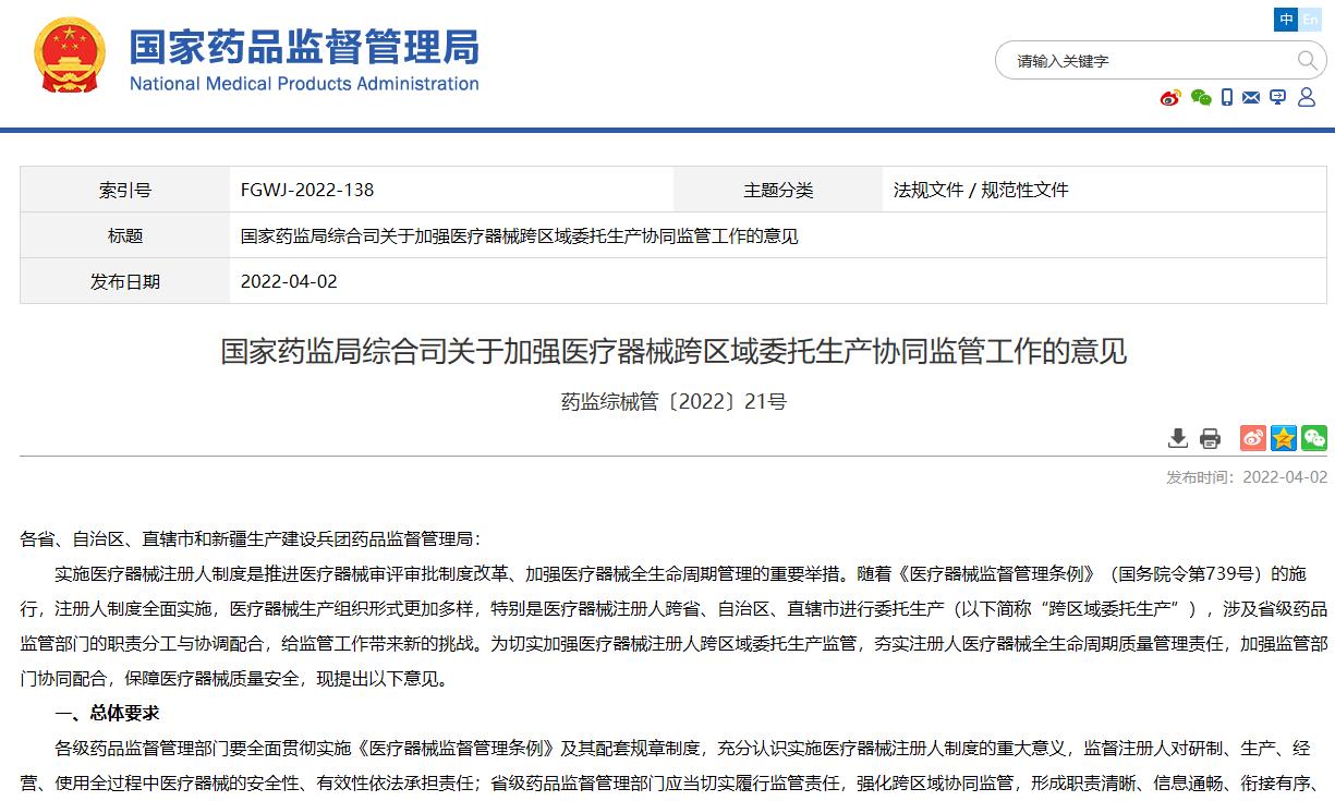 國家藥監(jiān)局綜合司關(guān)于加強醫(yī)療器械跨區(qū)域委托生產(chǎn)協(xié)同監(jiān)管工作的意見