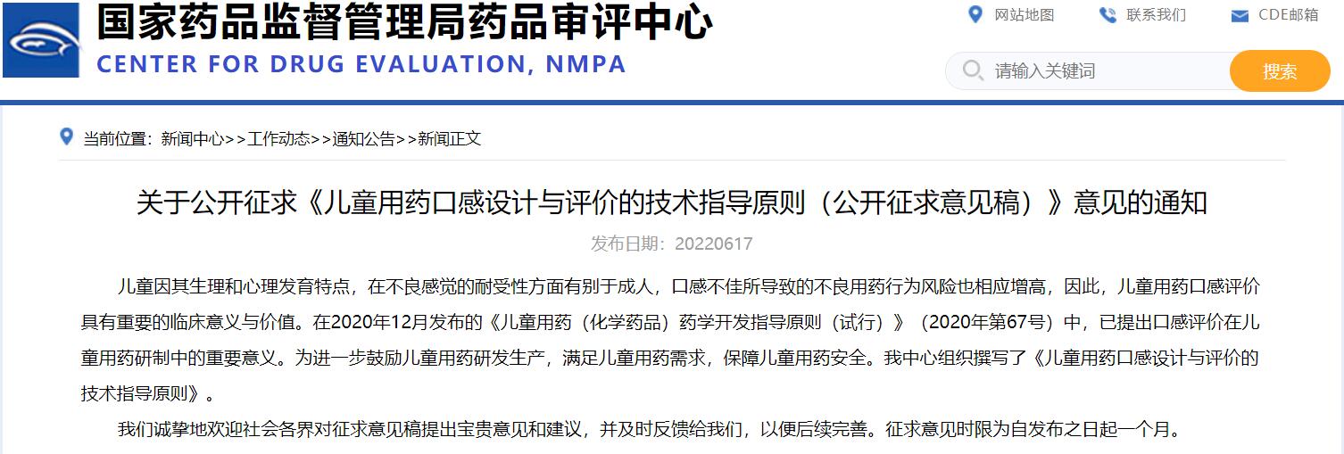 國(guó)家藥監(jiān)局藥審中心關(guān)于公開(kāi)征求《兒童用藥口感設(shè)計(jì)與評(píng)價(jià)的技術(shù)指導(dǎo)原則(公開(kāi)征求意見(jiàn)稿)》意見(jiàn)的通知