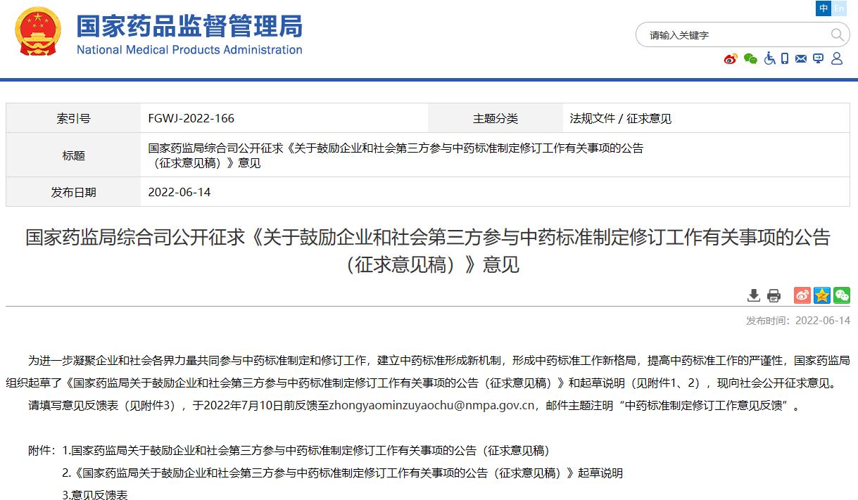國(guó)家藥監(jiān)局綜合司公開(kāi)征求《關(guān)于鼓勵(lì)企業(yè)和社會(huì)第三方參與中藥標(biāo)準(zhǔn)制定修訂工作有關(guān)事項(xiàng)的公告(征求意見(jiàn)稿)》意見(jiàn)