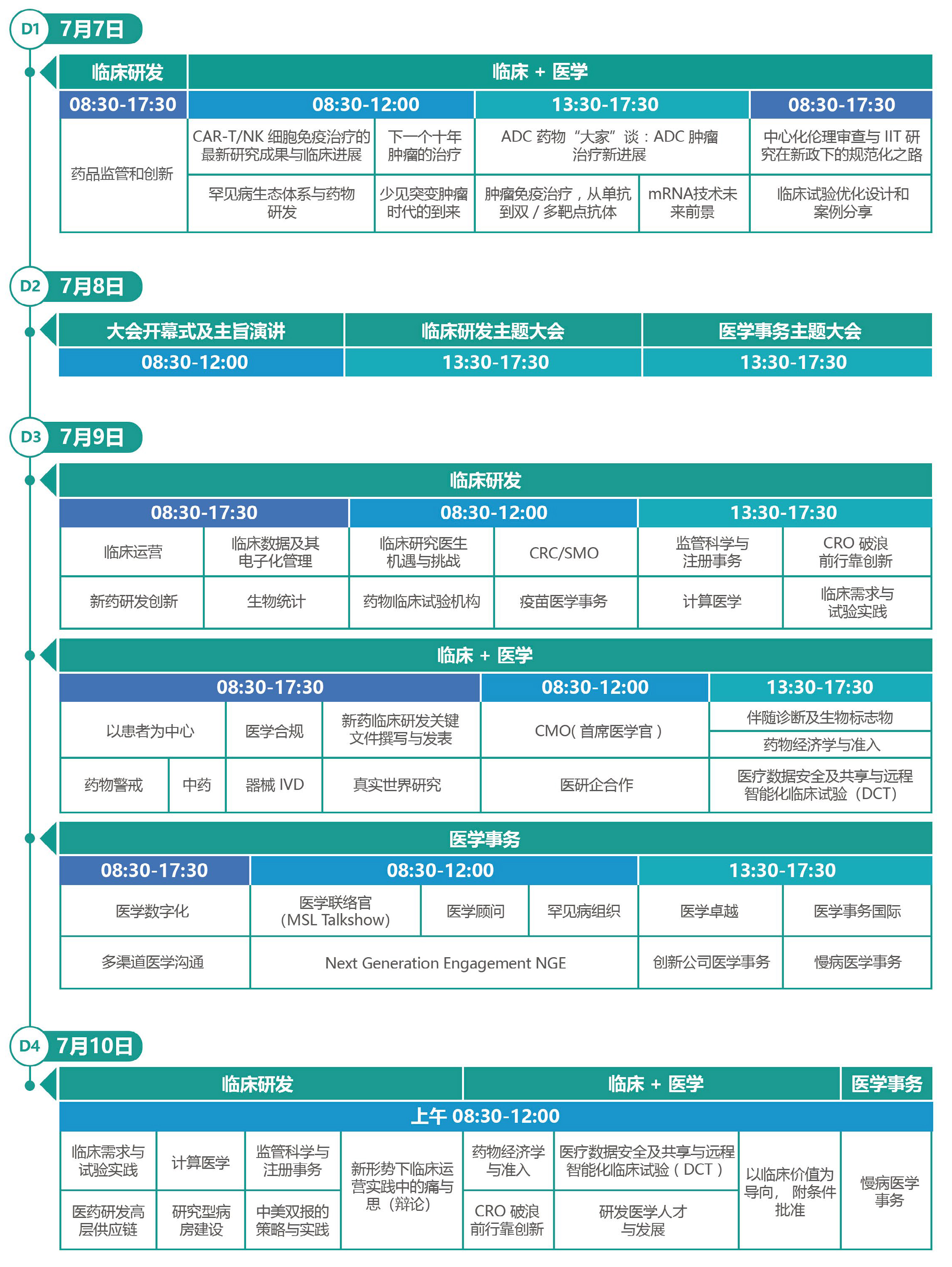本次會(huì)議圍繞藥品監(jiān)管與創(chuàng)新、治療領(lǐng)域醫(yī)學(xué)熱點(diǎn)、臨床研發(fā)、醫(yī)學(xué)事務(wù)等模塊進(jìn)行交流分享,同時(shí)設(shè)有12大專題論壇,演講專家達(dá)1000余人,緊跟行業(yè)發(fā)展趨勢,著力于解決參會(huì)同仁痛點(diǎn)及難點(diǎn)問題。