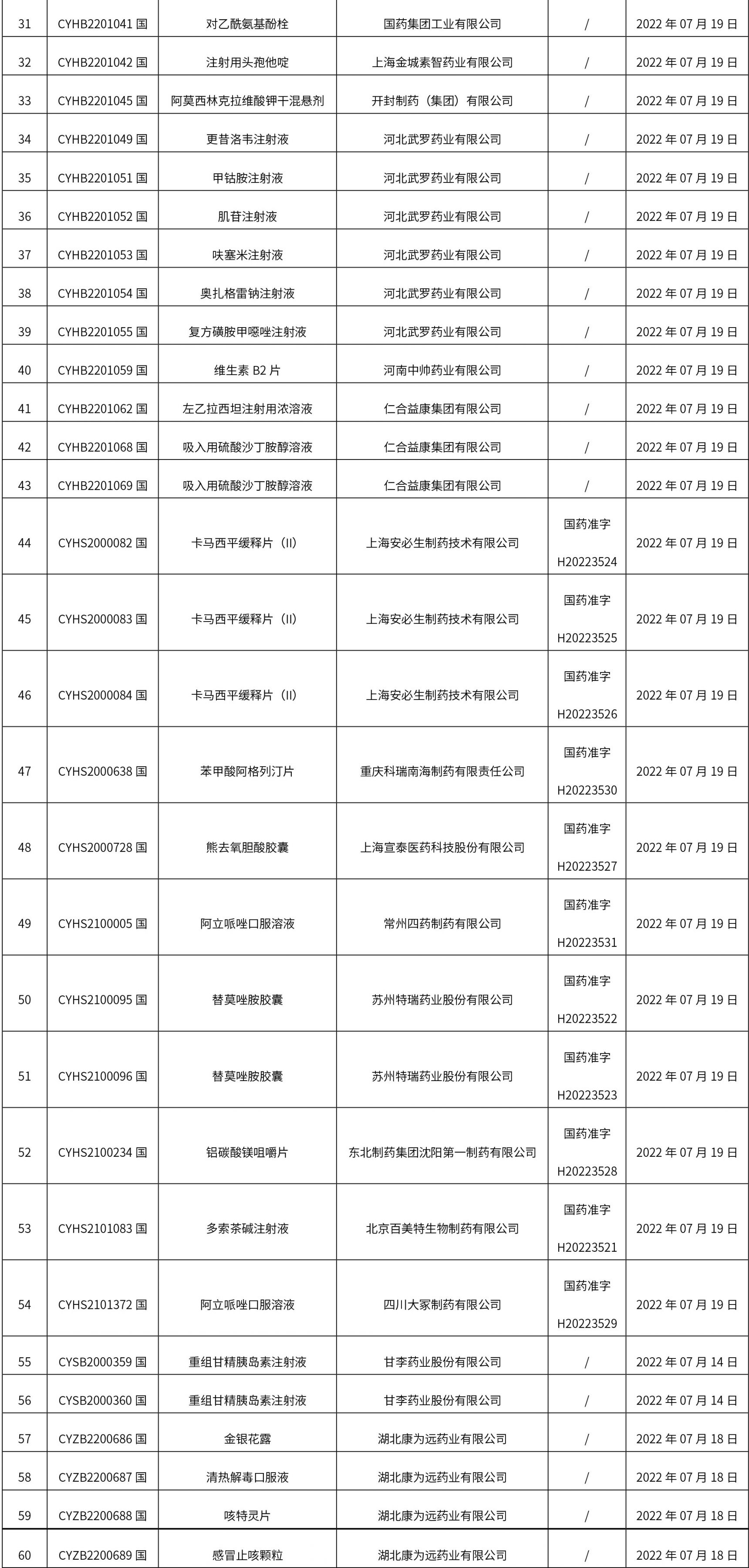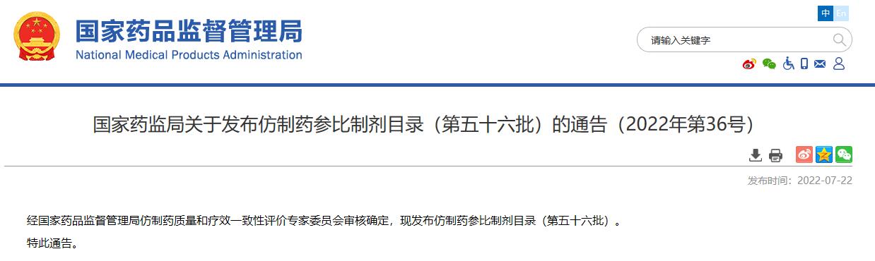 國(guó)家藥監(jiān)局關(guān)于發(fā)布仿制藥參比制劑目錄(第五十六批)的通告(2022年第36號(hào))
