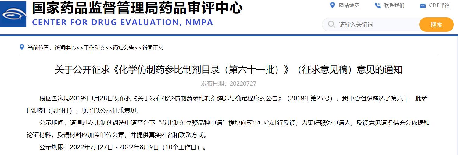 關(guān)于公開(kāi)征求《化學(xué)仿制藥參比制劑目錄(第六十一批)》(征求意見(jiàn)稿)意見(jiàn)的通知