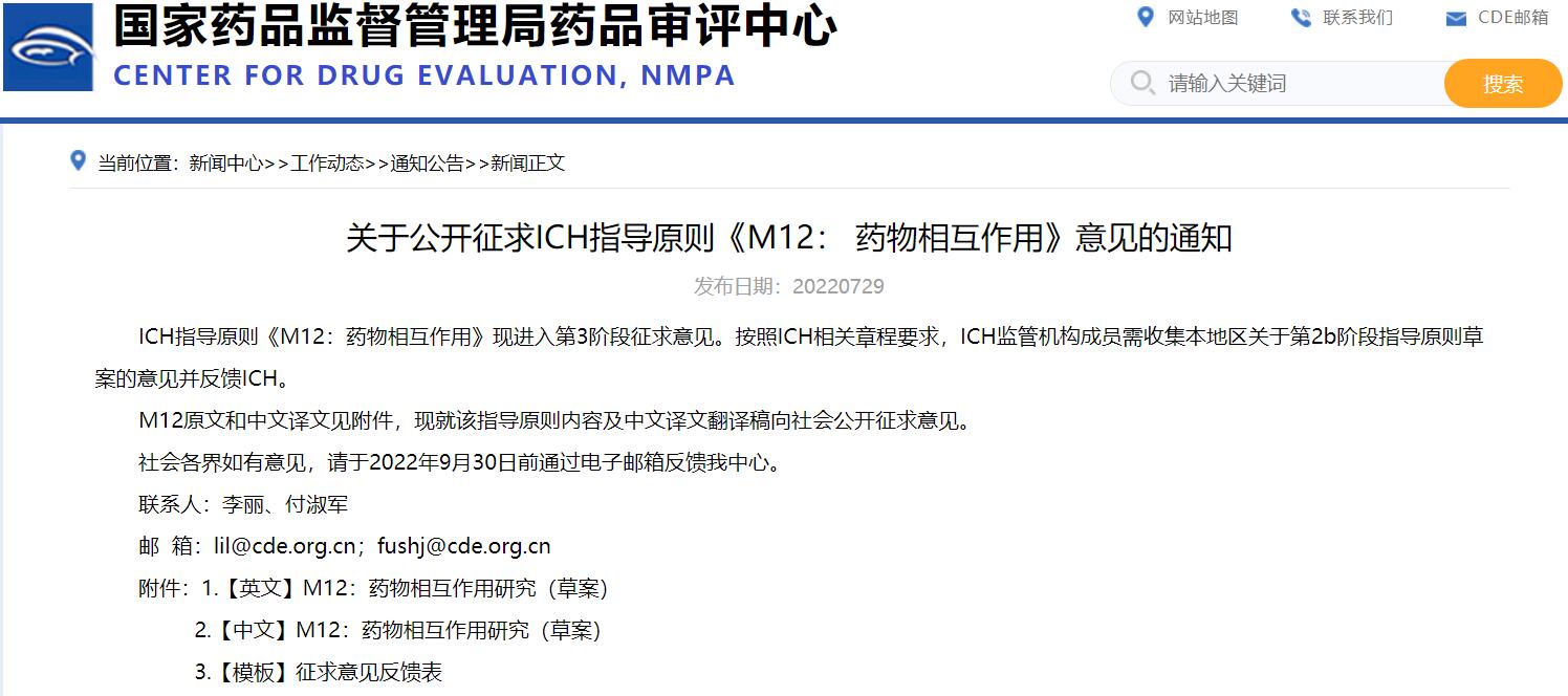 關(guān)于公開(kāi)征求ICH指導(dǎo)原則《M12:藥物相互作用》意見(jiàn)的通知