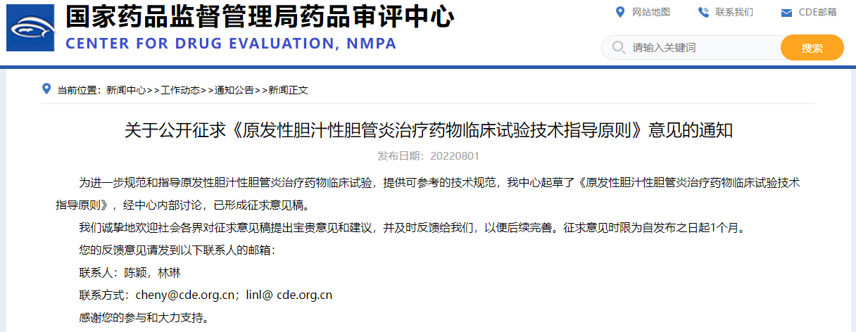 關(guān)于公開(kāi)征求《原發(fā)性膽汁性膽管炎治療藥物臨床試驗(yàn)技術(shù)指導(dǎo)原則》意見(jiàn)的通知