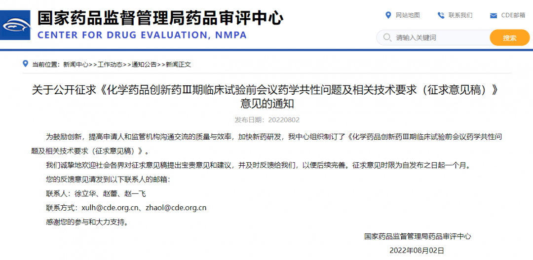 關(guān)于公開(kāi)征求《化學(xué)藥品創(chuàng)新藥Ⅲ期臨床試驗(yàn)前會(huì)議藥學(xué)共性問(wèn)題及相關(guān)技術(shù)要求(征求意見(jiàn)稿)》意見(jiàn)的通知