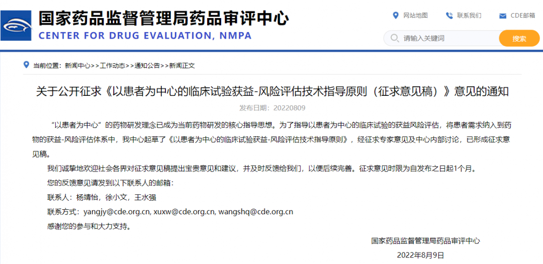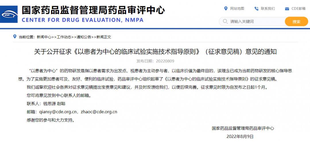 關(guān)于公開(kāi)征求《以患者為中心的臨床試驗(yàn)設(shè)計(jì)技術(shù)指導(dǎo)原則(征求意見(jiàn)稿)》意見(jiàn)的通知