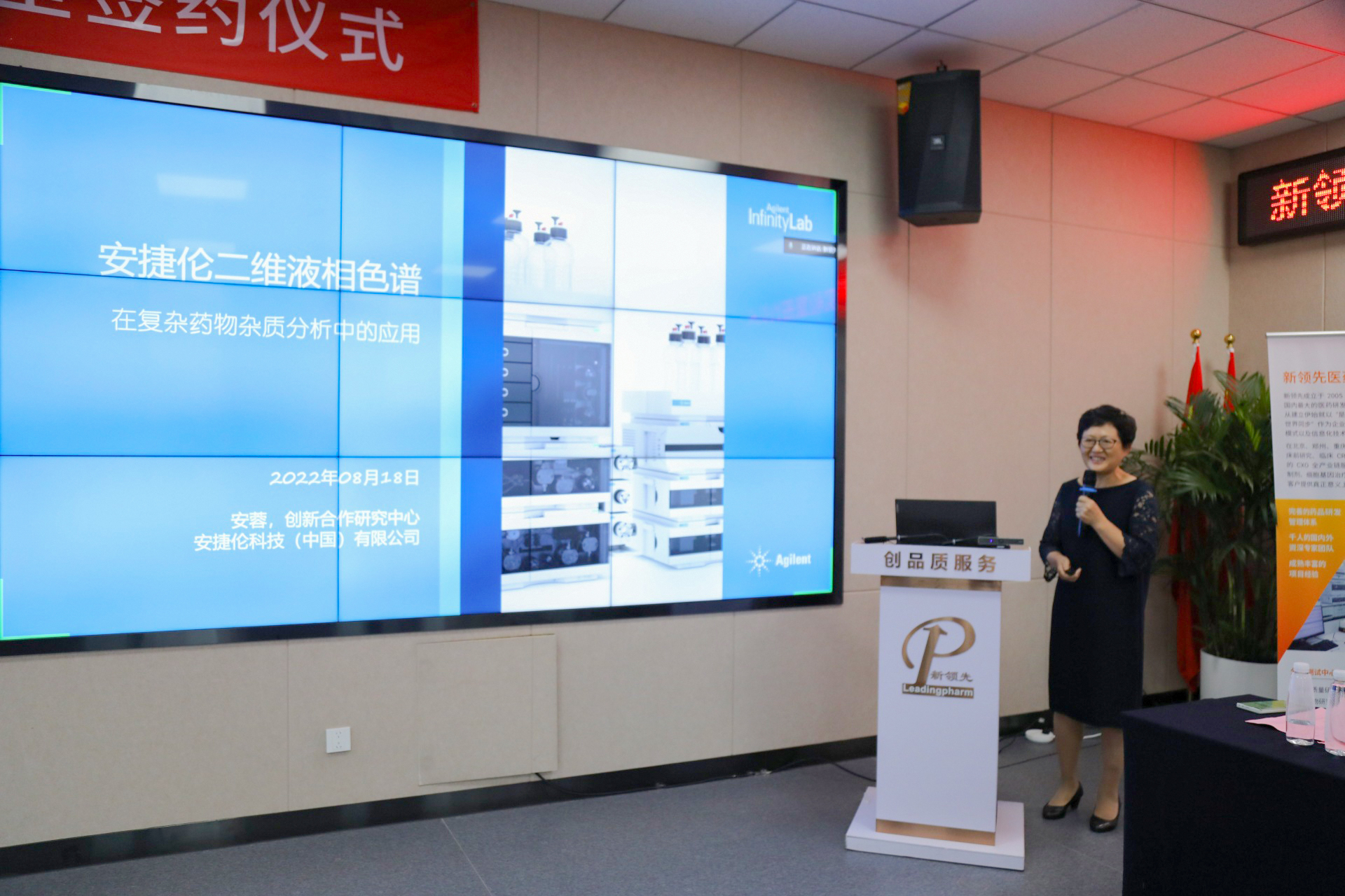 新領(lǐng)先醫(yī)藥總裁高世靜女士在致辭中,首先對推動本次合作的雙方領(lǐng)導(dǎo)和到場見證的專家和嘉賓表示由衷的感謝。她表示,本次合作得到了新領(lǐng)先董事長陶新華先生的大力支持。新領(lǐng)先是一家為全球制藥企業(yè)提供涵蓋創(chuàng)新藥、改良型新藥、仿制藥在內(nèi)的CXO全產(chǎn)業(yè)鏈服務(wù)的高新技術(shù)企業(yè),致力于攻克藥品研發(fā)全生命周期過程中各種技術(shù)問題,用創(chuàng)新的方式為客戶提供包括高端制劑研發(fā)、創(chuàng)新藥臨床研究、質(zhì)量體系建設(shè)、醫(yī)學(xué)方案設(shè)計指導(dǎo)等在內(nèi)的全面解決方案,贏得了近400家客戶的認可。新領(lǐng)先始終秉承“以客戶為中心”的服務(wù)理念,為客戶創(chuàng)造最大的價值,這點與安捷倫公司高度一致。安捷倫作為生命科學(xué)診斷和應(yīng)用化學(xué)市場領(lǐng)域全球領(lǐng)導(dǎo)品牌,在儀器應(yīng)用和檢測技術(shù)方面的優(yōu)勢突出,希望雙方強強聯(lián)手,依托創(chuàng)新研究聯(lián)合實驗室,實現(xiàn)優(yōu)勢互補,通過相應(yīng)合作課題的研究,更好地服務(wù)雙方共同的客戶,解決行業(yè)中的關(guān)鍵技術(shù)、熱點難題,有效推動行業(yè)的發(fā)展。也希望通過新領(lǐng)先CXO開放的平臺,協(xié)同產(chǎn)業(yè)鏈和供應(yīng)鏈合作伙伴,實現(xiàn)更多以滿足臨床需求為根本的新技術(shù)、新產(chǎn)品上市,解決患者的用藥需求。