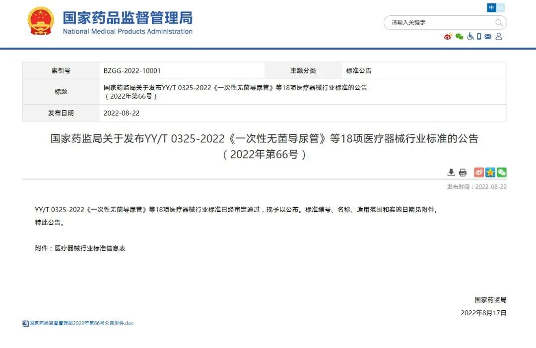 國家藥監(jiān)局關(guān)于發(fā)布YY/T 0325-2022《一次性無菌導(dǎo)尿管》等18項醫(yī)療器械行業(yè)標(biāo)準(zhǔn)的公告