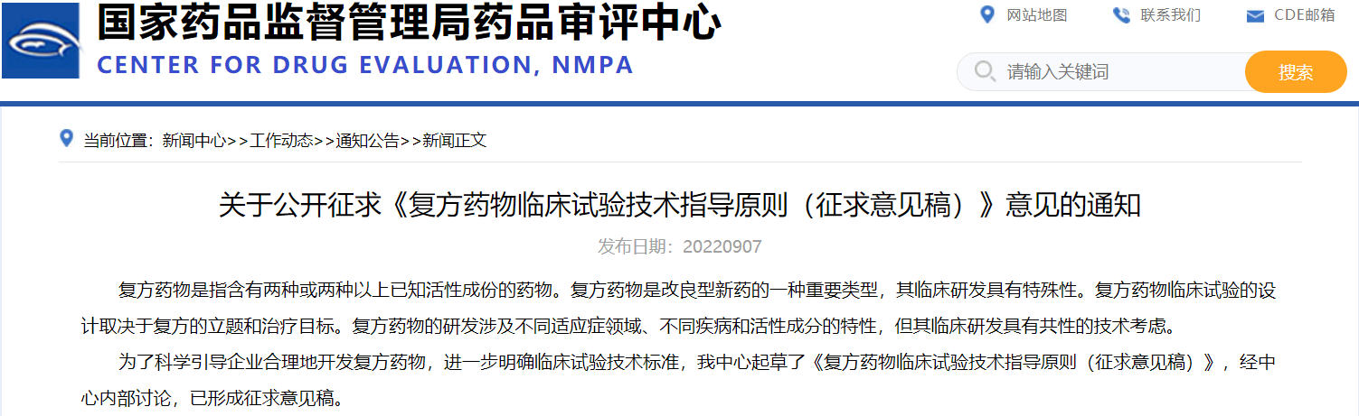 《關(guān)于公開征求《復(fù)方藥物臨床試驗技術(shù)指導(dǎo)原則(征求意見稿)》意見的通知》