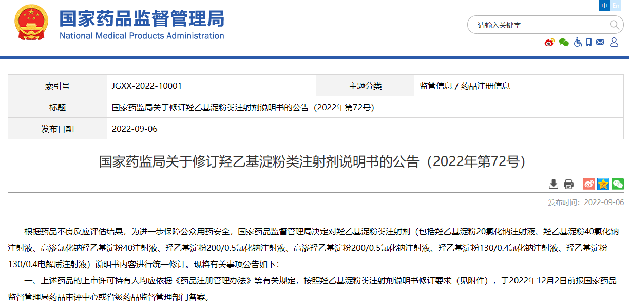 國家藥監(jiān)局關(guān)于修訂羥乙基淀粉類注射劑說明書的公告(2022年第72號)