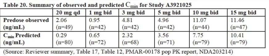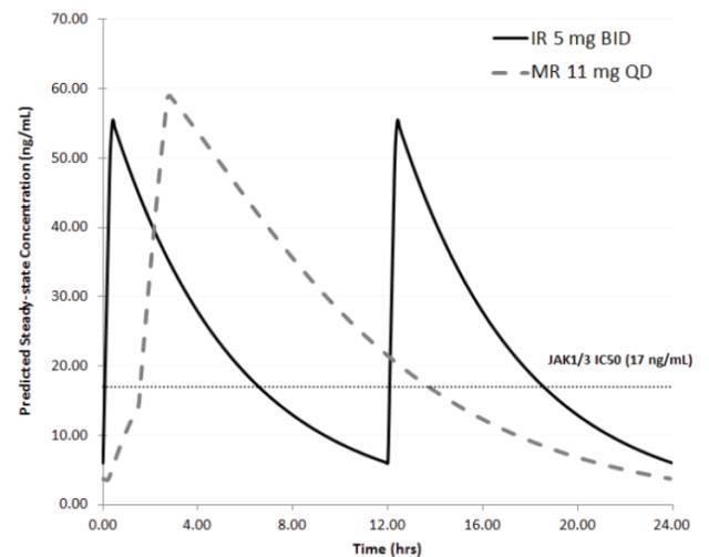 ·多劑量研究中(連續(xù)服用5天),托法替布緩釋片11mg(qd)與托法替布片5mg(bid),開(kāi)展BE試驗(yàn)。