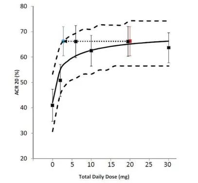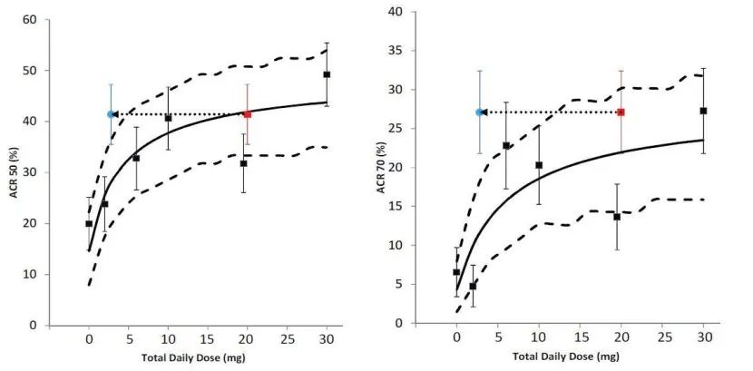 本品種PD研究中以美國(guó)風(fēng)濕病學(xué)會(huì)(ACR)規(guī)定觀指標(biāo),若患者達(dá)到20%、50%或70%的緩解,即達(dá)到ACR20、ACR50或ACR70緩解。